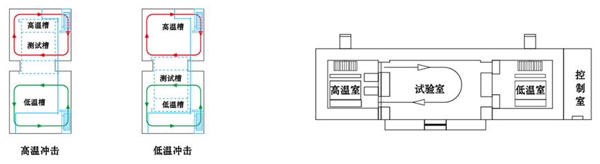 兩廂設備區(qū)分為高溫區(qū)和低溫區(qū)兩部分,測試產(chǎn)品置于提籃中,沖擊時提籃將測試產(chǎn)品 |